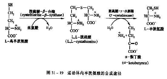 在动物体内半胱氨酸的直接前体为丝氨酸和高半胱氨酸。丝氨酸和高半胱氨酸在胱硫醚β-合酶作用下形成L-胱硫醚,后者在胱硫醚-γ-水解酶(胱硫醚-γ-裂合酶)作用下,分解为α-酮丁酸、NH4+、和L-半胱氨酸(路线见截图)。截图来源于王镜岩的《生物化学》下册355页。 360截图-13294640.jpg |