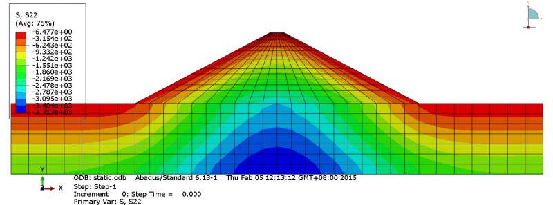如果不加*initial conditions,type=stress,计算结果在分布和数值上都是合理的,如附件图1,是竖向沉降分布