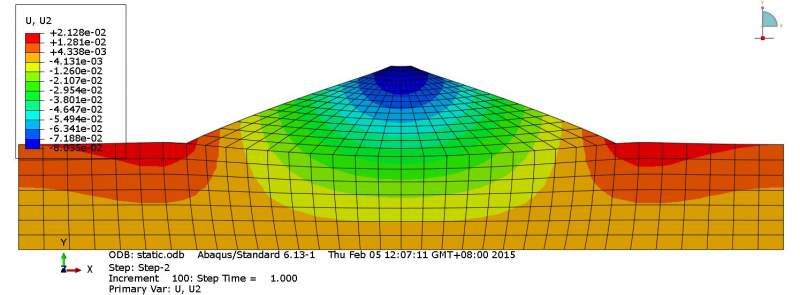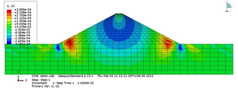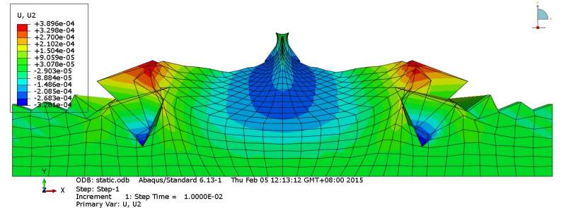 但是同样的计算模型,只是加入了一个初始应力场,计算出来的竖向沉降的量值与分布就完全不同,如图3(这里我加的初始应力场是这个模型的自重应力场,所有计算都是先加初始量,再step-1,static来加自重,在step-2,soil来固结)