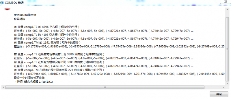 我在用comsol中的系数偏微分方程模块模拟纳米粒子的耦合传热,计算时报出一堆错误,请大神们指点一二!错误截图如下 请大神们说说这些错误的原因都有哪些,现在一点头绪也没有 不知道怎么改