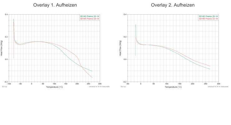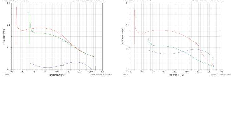 下面的DSC图谱中红线的是聚氨酯,绿色线是聚氨酯+聚酰胺(尼龙),从DSC图谱中能看出他们的区别吗?他们的玻璃花转变温度各式多少?怎么看不到他们的结晶和熔融峰呀?求大神详解,谢谢!