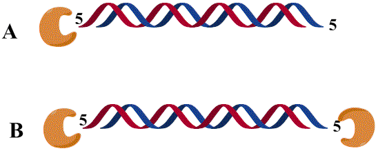 请问lambda核酸外切酶降解双链DNA时,是从一端降解还是两端同时讲解?也是就我画的图中的A方式还是B方式? 另外,其余的外切酶,如EXOIII呢? 也许这个问题对生物很简单,但本人是学化学的,不了解,特求解。谢谢 untitled.gif |