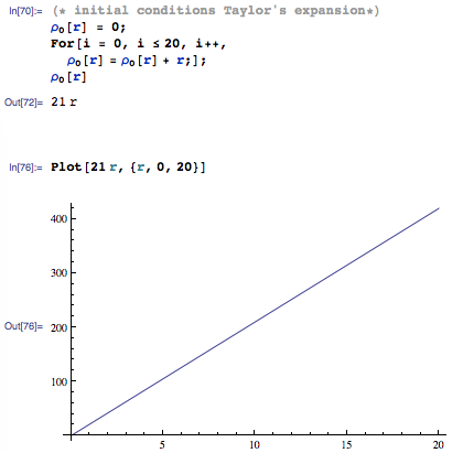 那就解释一下。问题核心在于Plot函数具有HoldAll属性(印象里所有画图函数都有这个属性),这个属性会先对被用于画图的表达式赋值再计算该表达式,对于你的表达式而言,这就意味着 将会变成 这样自然计算不出任何值。而我加了 //Evaluate 则会强制计算你那个表达式,你的表达式计算后得到 21 r,此后再赋值当然也就没有问题了——于是,Mathematica咋这么不好用?我就想给我的表达式起个函数名都不行?当然行,但是你得使用正确的函数定义方法,也就是说,只要你把 改成 就行了。 此外可说的地方其实还有很多。 1 提问的时候只贴图片不贴代码是个不好的习惯。 2 For循环在Mathematica里在大多数大多数大多数的情况下都是应该避免的,你这代码也不例外。 3 下标实际上也是应该避免的,不论是从输入的方便程度考虑还是从编程方便程度上来考虑,都应该使用诸如\[Rho][0][r]之类的书写…啊,细说下去又没完了,就此打住。总之,下面哪个写法都比For循环强: 更多的内容,你就好好翻翻软件的自带帮助吧。 |