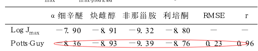 Potts-Guy公式如图 数据如图 带入文献中的数据 算出的结果和文献不一样·····求大侠解答 公式.png 文献相关参数8.png 文献结果.png 例如: 细辛醚我的计算结果为-5.62·······求指出问题出在哪里 |