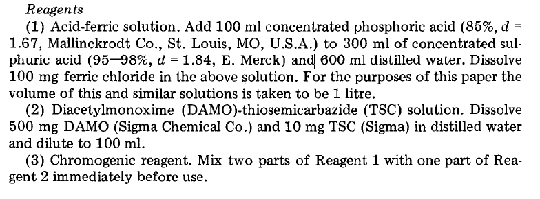 用二乙酰一肟法测定尿素水溶的浓度,加入的试剂有二乙酰一肟,硫氨脲,浓硫酸,磷酸和三氯化铁,但是一直不显色,用分光光度计测也没有吸收。 以为是显色时间不够长,但两个多小时还一直没有吸收。找不到有其他什么原因。 配溶液步奏是按照文献的步奏来的。 见下图。 urea.png |