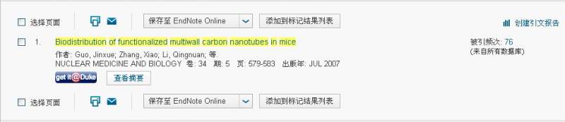 哪位达人能帮忙查查下面这篇论文是否是ESI高被引论文。谢谢! Biodistribution of functionalized multiwall carbon nanotubes in mice; Nuclear Medicine and Biology, 2007, 34(5), 579-583. |