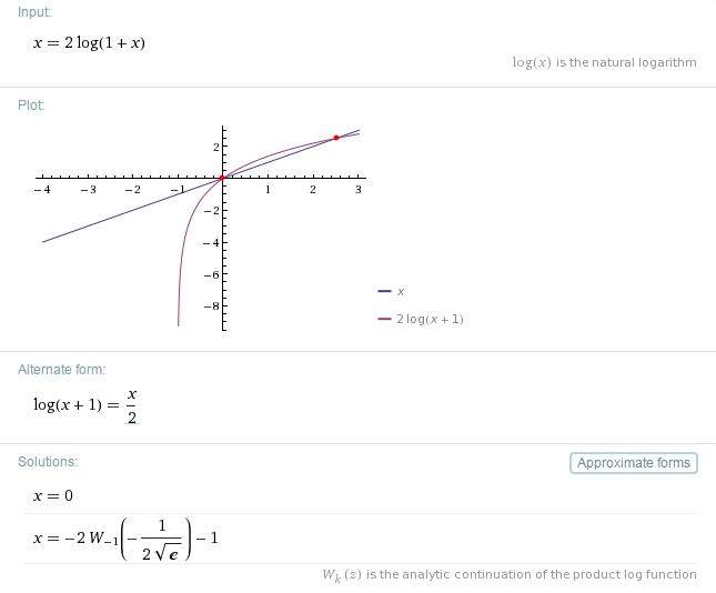 | 请帮助求解超越方程:x=2*ln(1+x),谢谢了 |