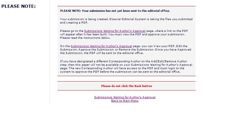 各位投稿"journal of pharmaceutical and biomedical analysis"的大侠们,我前几部分都是按杂志的要求和提示上传文章的题目、摘要、关键词、等等.就是到了传完文章后杂志要求我转化为PDF我按照杂志的链接点击转化为PDF后,网站显示:“you have no submissions awaiting approval.please click the Author Main Menu button to teturn to the main menu"? 这是为什么????
