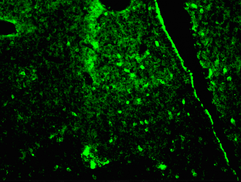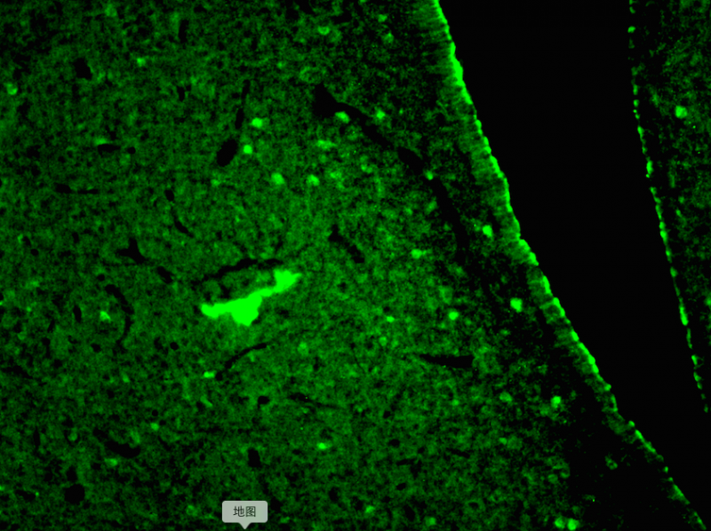做的是鸡脑GABA能神经元的染色,双染,下面的图显示的是染细胞的,绿色荧光。需要通过这图查细胞数,但感觉很费劲