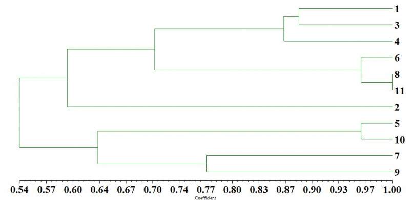 用NTSYS2.1做聚类,得到树状图后,我该以多少相似系数为分界点来把样品聚成不同簇群?如附图,同样是分成6个簇群,以0.77到0.87之间任选一个分界点都是一样的结果,那我该选择哪个值?如果将分界点设在0.67时,又只分成4个簇群,到底该怎么选择,,谢谢各位前辈了!!