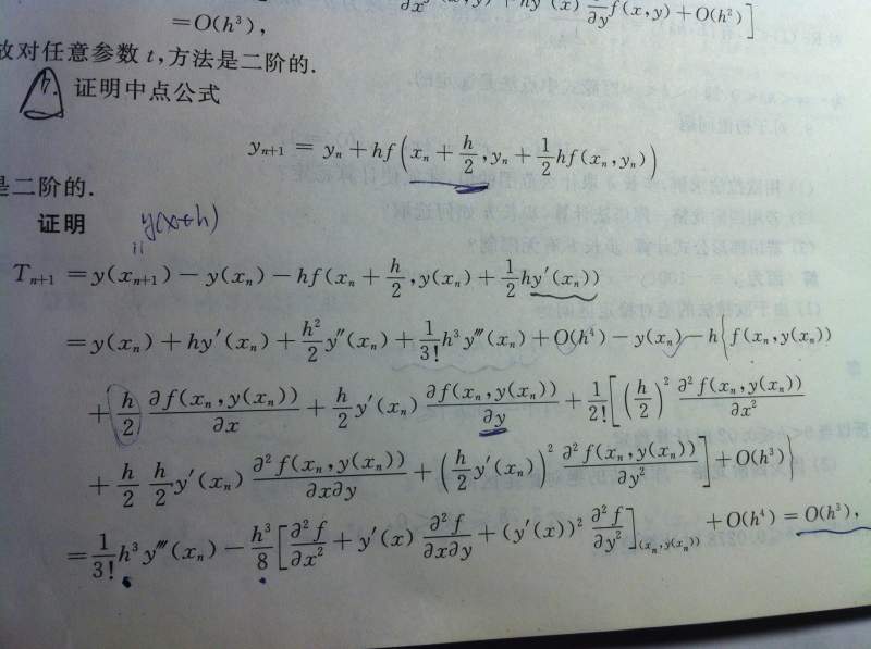 这个我知道,我就是看不懂hf(xn+h/2,y(xn)+1/2hy'(xn))这个式子是怎么计算的。貌似是高阶求导,答案里似乎还有泰勒展开吧,不明白。。。