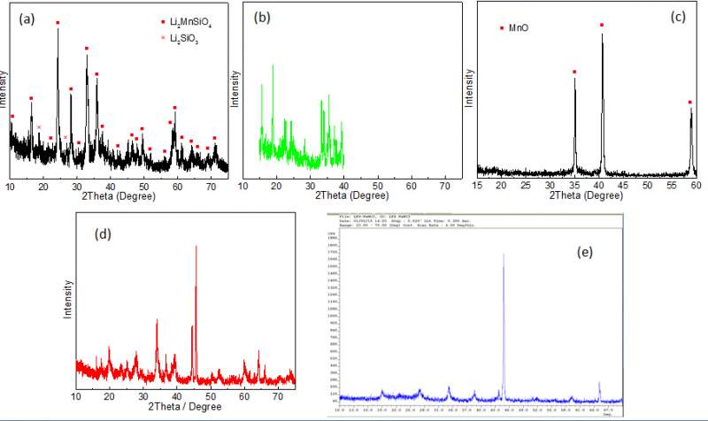 (a) LiOH, Mn(Ac)2, TEOS, citric acid, 20ml乙醇(含水0.18 ml),产物Li2MnSiO4,XRD表征如图(a)