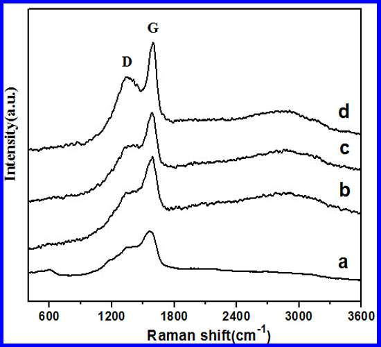 本人在惰性气氛中不同温度下热解一种有机物质,将他们用拉曼表征,如下图,a,b,c,d分布为300,400,500,600度