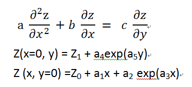 x的边界条件感觉不够。若不考虑y的因素,x的二阶方程至少要两个x的边界条件。比如PZ/Px当x=0时的情况,比如为f(y)。若Z关于x的拉式变换为U(s,y),则对方程两边关于x求拉式变换后得到: a*{s^2*U(s,y)-s*[z1+a4*exp(a5*y)]-f(y)}+b*{s*U(s,y)-[z1+a4*exp(a5*y)]} =c*dU/dy 这是一个一阶线性常系数非齐次方程,求解有专门的公式的。求出U(s,y)后,由Z(x,0)=Z0+a1*x+a2*exp(a3*x),对其求关于x的拉式变换,得到: U(s,0)=Z0/s+a1/(2*s^2)+a2/(s-a3) ,将其代入前面的U(s,y),确定其中的待定函数,然后再对其求拉式反变换,最终得到Z=Z(x,y)。 |