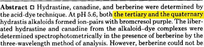 白毛莨碱(或北美黄连碱)的叔胺、季胺衍生物在pH5.6条件下与溴甲酚紫形成离子对复合物。
