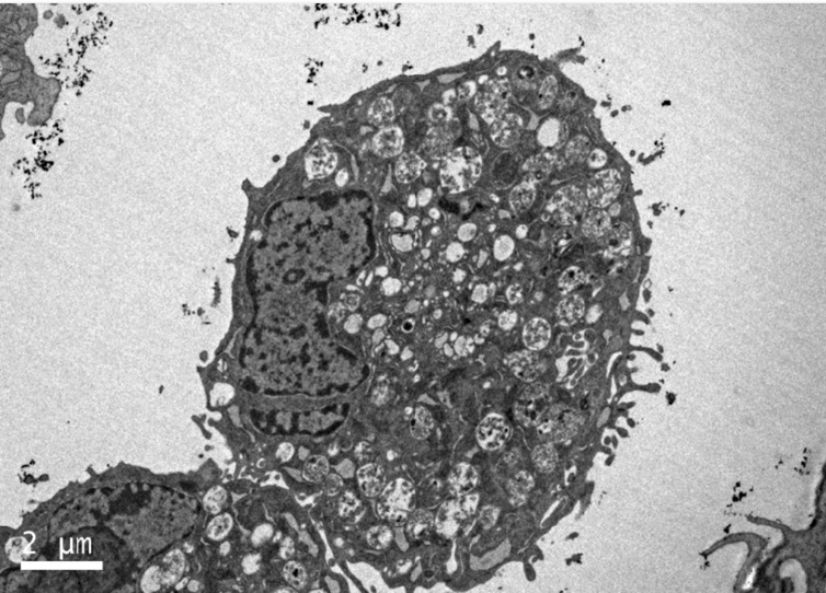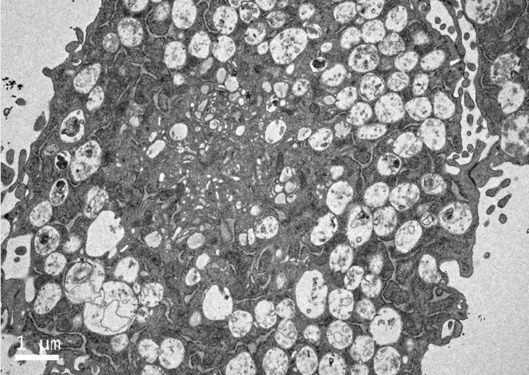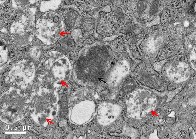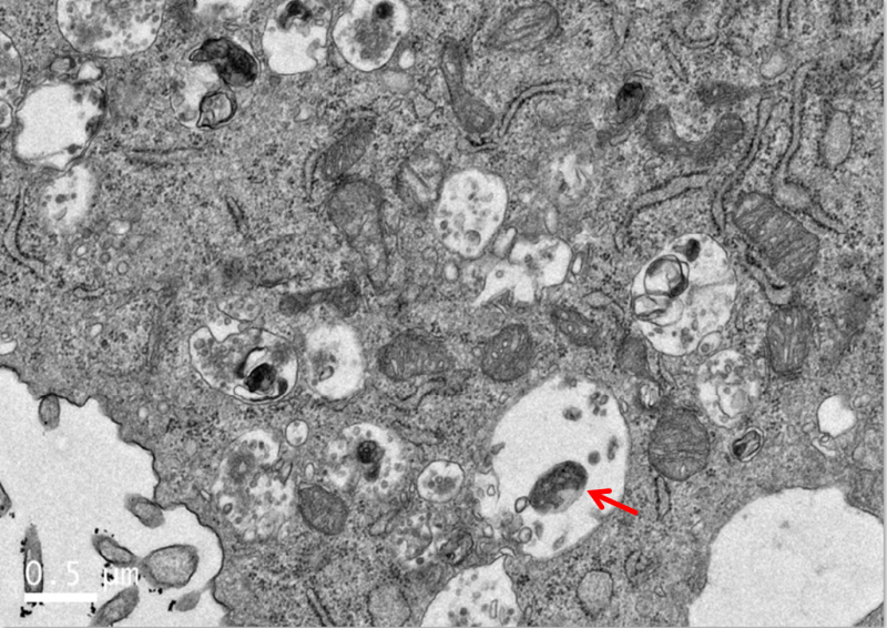 这是大鼠肝实质细胞BRL-3A细胞在我实验处理24h后的TEM图片,在实验组的细胞中出现很多空泡化的结构(红色箭头标注),我判断为自噬体,但是自噬体是双层膜,这个是单层膜;如果不是自噬体,这些泡泡会是什么呢?请高人指教,多谢!