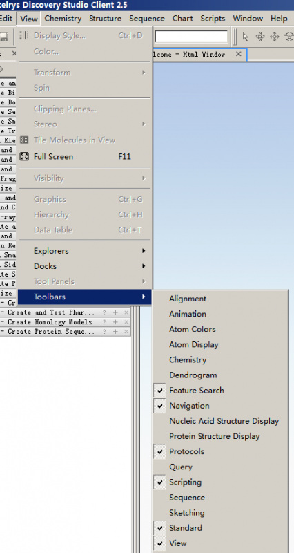 | Discovery Studio 2.5中Protocols toolbar在哪里?怎样运行?找半天没找着 |