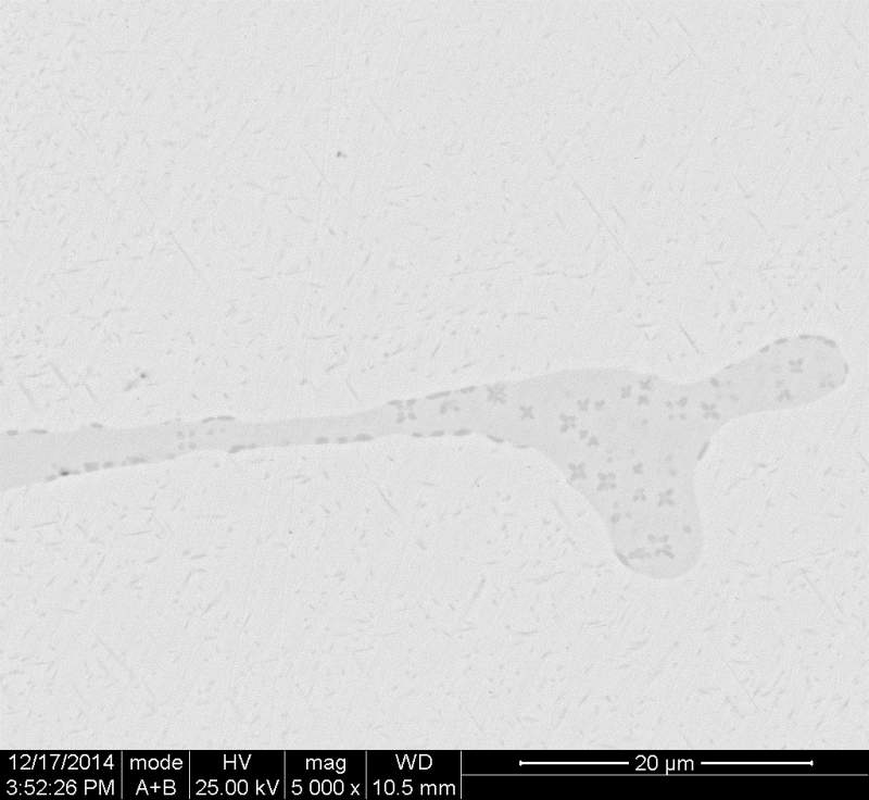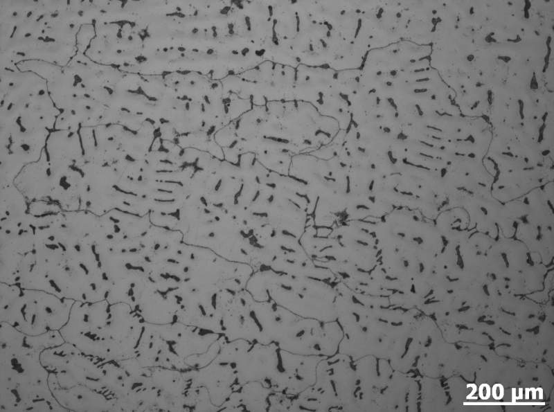 XRD分析出?硎莂ustenite,那dendrite的部分就是iron austenite。至於樹枝間會是共晶相,應該是量太少,所以XRD打不出?怼_@可能要進TEM?矸治觥R驗槟愕腃r很高,所以應該不會是單純的鎳鋁介金屬,另外也有可能是鐵鋁介金屬。