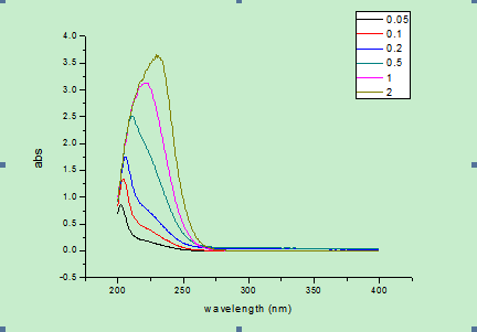 我是用UV-2550紫外分光光度计进行测量,第一组测量的目标物是乙二硫醇,溶剂为乙醇,第二组测量的目标物为乙二硫醇,溶剂为乙醇:水体积比=1:1,乙二硫醇的浓度分别为0.05,0.1,0.2,0.5,1,2g/L,测量出来的光谱图如下,峰值漂移的非常厉害,求大神分析指导。 第一组(溶剂为乙醇) 第二组(溶剂为乙醇+水) |