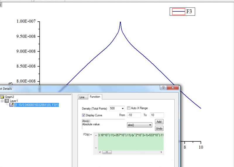 origin公式绘图 可是由于公式复杂 无法显示图形 提示Math cannot be performed on Text column 请高手讲解如何绘出下列公式 y=3.16*10^-11+357*10^-11/(x^2*10^2+1)+533*10^-11/(x^2*1^2+1)+3960*10^-11/(x^2*0.1^2+1)+3580*10^-11/(x^2*0.01^2+1)+1210*10^-11/(x^2*0.001^2+1)+250*10^-11/(x^2*0.0001^2+1)+80.8*10^-11/(x^2*0.00001^2+1)+22.2*10^-11/(x^2*0.000001^2+1)+4*10^-11/(x^2*0.0000001^2+1)+2.22*10^-11/(x^2*0.00000001^2+1) 真心感谢! |