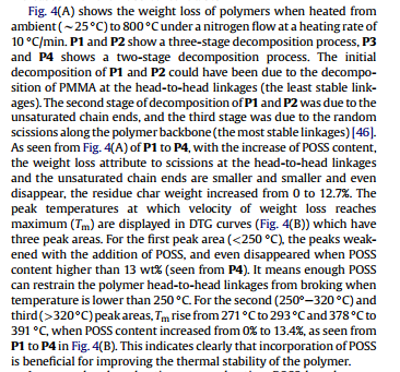 情景:一个共聚物,测试DSC-TGA,图上有两个分解阶段,文中给出对这一现象的解释,如下。其中BMA是甲基丙烯酸丁酯,PBMA是甲基丙烯酸酯聚合物的意思。请大家帮我看下下面这句话是什么意思。 The initial decomposition could have been due to the decomposition of PBMA at the head-to-head linkages (the least stable linkages). The second stage of decomposition was due to the random scissions along the polymer backbone (the most stable linkages) |