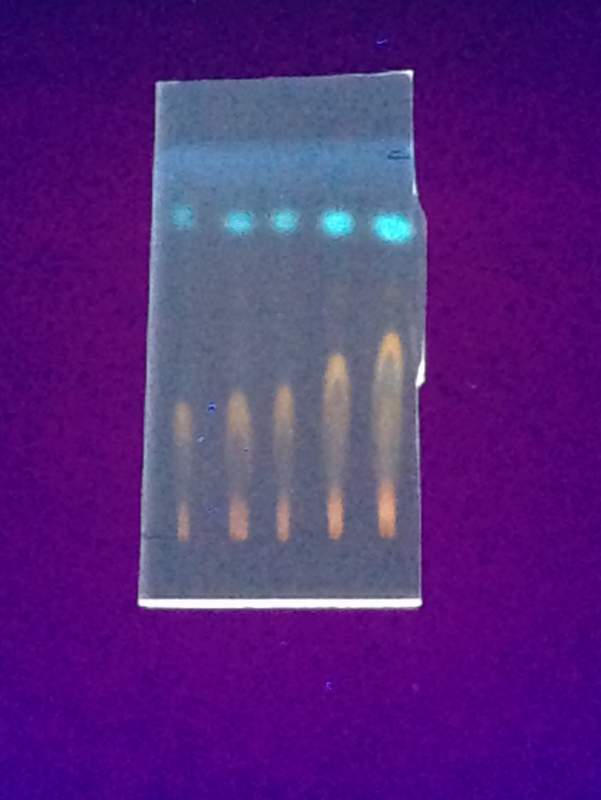 用乙酸乙酯:石油醚=1:2跑薄层板,结果见下图,紫外透射光源拍照。