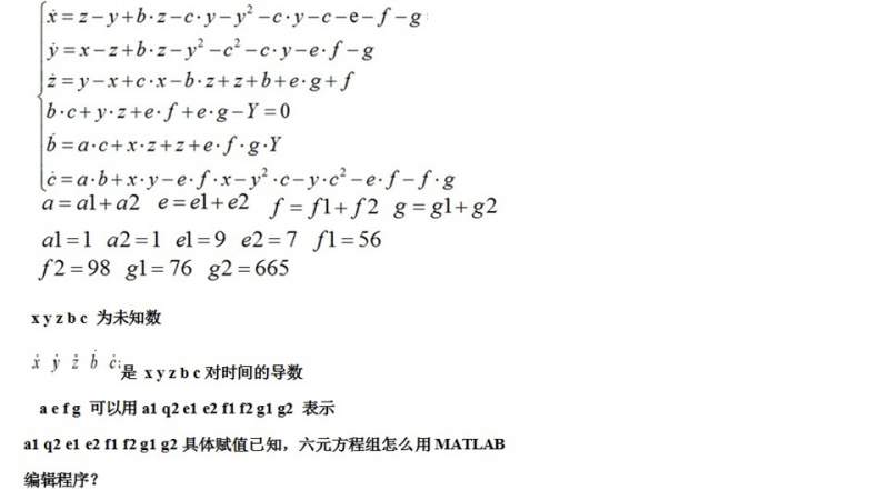 http://muchong.com/bbs/viewthread.php?tid=8647830&pid=10#pid10 已经看到了,谢谢耐心讲解 MATLAB程序中的式子已经按照图片修改过了 前期是想程序的可行性,还是想的简单了 运算后还是那些错误结果 dx=[dx(1);dx(2);dx(3);dx(4);dx(5);dx(6)] 确实是习惯写成dx(6)了,当时没注意 但确实有六个变量啊 写成:dx=[dx(1);dx(2);dx(3);dx(4);dx(5)] 那么x(6)怎么办呢? 彻底不会写了 |