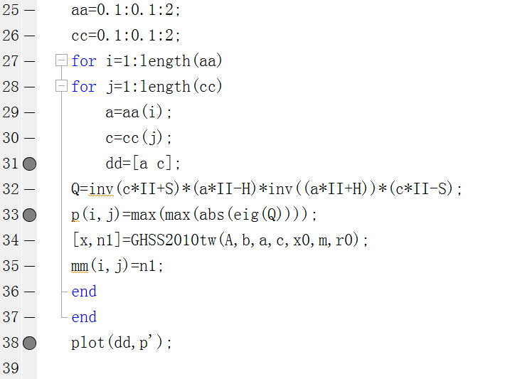 这是某个迭代法程序,a,c是参数,Q是迭代矩阵,想要找出使迭代矩阵谱半径最小的参数a和c,在31,33,38行分别出现了疑问,dd这个时候怎么变成自变量?p(i,j)是二元的可以这样表示吗?怎么打印出(或者画出)自变量dd与谱半径p(i,j)的所有数据?