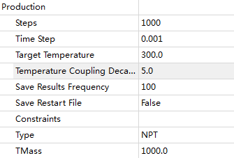 time step只能设0.001(1fs)或者0.002(2fs),如果设置成0.002还要设置另外一个氢键震动限制。然后相应的调整save frequency=100或者50