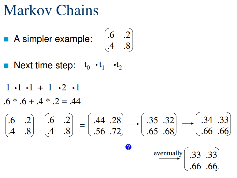 ?那一步是对计算结果再进行两次变换后(即乘以两个矩阵A=[0.6 0.2;0.4 0.8])得到,而最后的结果(eventually)是说矩阵相乘的结果基本上不再发生改变,即A^n*A=A^n。注,用matlab演算eventually后面的结果为[0.33 0.33;0.67 0.67]