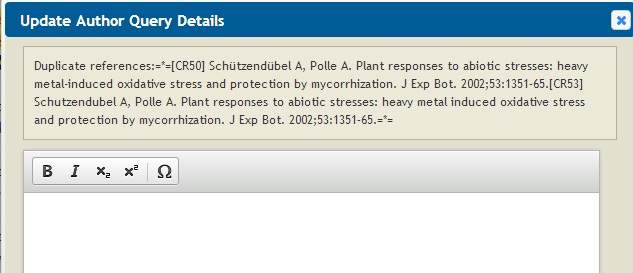 今天女朋友那篇文章校稿,但是其中有一个问题没看懂。如下图所示:说duplicate references,但我看了文章这个文献只在一个地方出现,只引用了一次。怎么就成重复引用了?什么叫重复引用,没搞懂,还请高手帮忙看下,谢谢! 无标题.jpg |