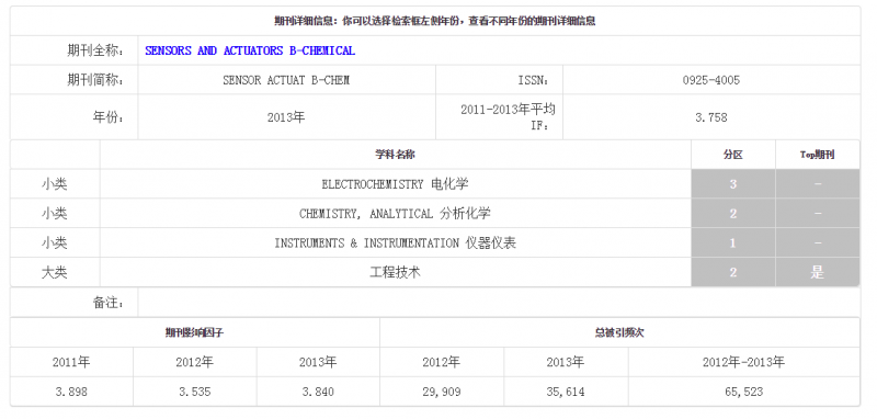 谁能帮忙查一下Sensors and Actuators B: Chemical在2014年中科院JCR期刊中的分区数据