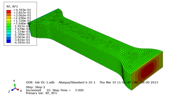问题一: 首先我使用位速度控制加载荷的,所以想得到仿真后的支反力和位移。软件中只能得到节点的支反力,我想得到面的支反力应该怎么做,是不是把面上所有节点的支反力相加就可以了? 问题二: 在仿真中对不同的网格大小分别进行计算,计算结果却相差很大,是不是网格越小越好?请具体到我的模型来说。 模型图如下: 11111.png 下图为支反力云图,我想得到的是右下侧面的支反力。 22222.png |