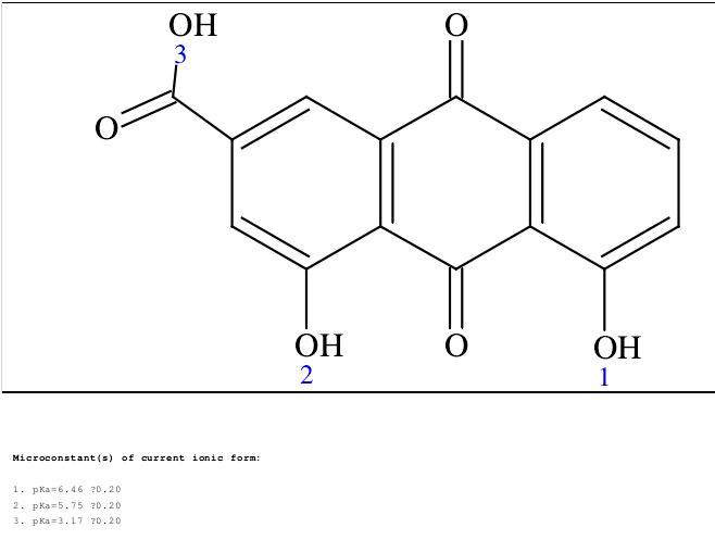 我想看下例如下面结构的分子的pka值,用ACDLABS软件计算结果如图所示,因为含有多个酚羟基,所以每个基团都有pka值,这种情况下我应该怎么评价这个分子的pka值呢?如果几个基团pka值差值较大是不是可以采用最小值?如果很接近的话怎么采用呢? 大黄酸.jpg |