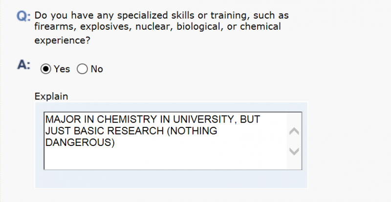 这个选项在Work/Education/Training板块中,请问应该是填YES还是NO?本人确实是化学专业的,但是看这个题目的意思感觉选YES好像对签证会不太好。如果选YES,图中那样写行吗?