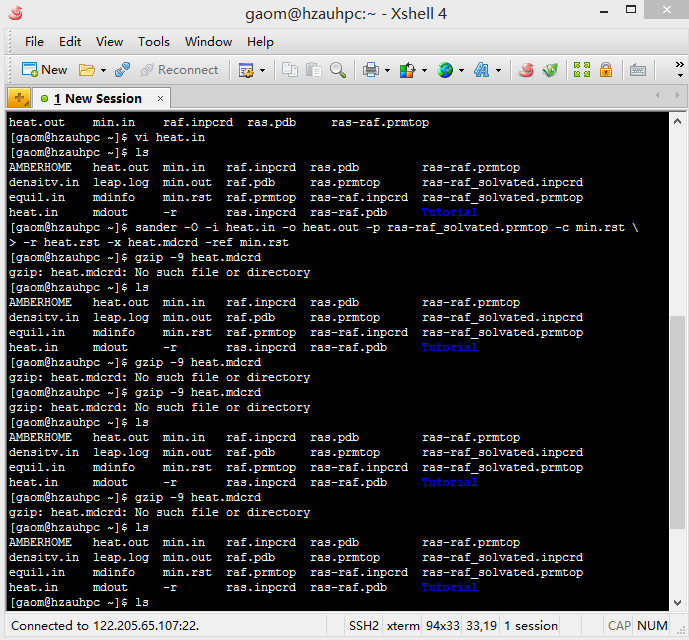 打开.out文件。如果是正常结束,最后会有时间信息等。min.out中是每隔n步输出详细能量项,heat.out和md.out中类似,多了时间信息,可以知道算了多少ps。