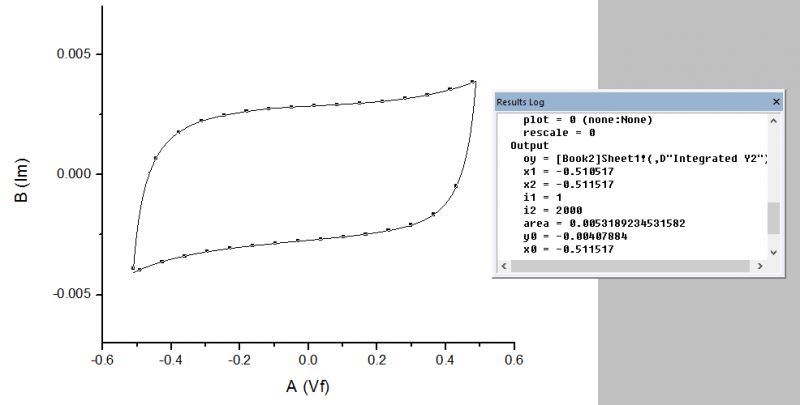 RT, 以下是我计算电容的公式C=(∫IdV)/(2∙M∙∆V∙Scan rate),还有实验得到的CV图,想问问我这么算对吗?用Origin算积分面积,就是mathematics 里面的integral,取absolute area,我感觉我的积分面积很小,area = 0.0053189234531582,感觉有问题但是又不知道是什么