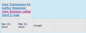 文章二审一个月零一周,今天下午收到编辑邮件,如下:(文章状态如图,编辑已接收,Accept),但是就是找不到审稿人的意见啊?怎么破?是不是要给编辑发邮件问一啊? Dear Dr. xxx, I am pleased to confirm that your paper "xxxxx" has been accepted for期刊名称 Comments from the Editor and Reviewers can be found below. NOTE: Upon submitting your revised manuscript, please upload the source files for your article. For additional details regarding acceptable file formats, please refer to the Guide for Authors at: http://www.elsevier.com/journals/期刊名称/0928-4931/guide-for-authors When submitting your revised paper, we ask that you include the following items: Response to Reviewers (mandatory) This should be a separate file labeled "Response to Reviewers" that carefully addresses, point-by-point, the issues raised in the comments appended below. You should also include a suitable rebuttal to any specific request for change that you have not made. Mention the page, paragraph, and line number of any revisions that are made. Manuscript and Figure Source Files (mandatory) We cannot accommodate PDF manuscript files for production purposes. We also ask that when submitting your revision you follow the journal formatting guidelines. Figures and tables may be embedded within the source file for the submission as long as they are of sufficient resolution for Production. For any figure that cannot be embedded within the source file (such as *.PSD Photoshop files), the original figure needs to be uploaded separately. Refer to the Guide for Authors for additional information. http://www.elsevier.com/journals/期刊名称/0928-4931/guide-for-authors Highlights (mandatory) Highlights consist of a short collection of bullet points that convey the core findings of the article and should be submitted in a separate file in the online submission system. Please use 'Highlights' in the file name and include 3 to 5 bullet points (maximum 85 characters, including spaces, per bullet point). See the following website for more information http://www.elsevier.com/highlights Graphical Abstract (optional) Graphical Abstracts should summarize the contents of the article in a concise, pictorial form designed to capture the attention of a wide readership online. Refer to the following website for more information: http://www.elsevier.com/graphicalabstracts When your paper is published on ScienceDirect, you want to make sure it gets the attention it deserves. To help you get your message across, Elsevier has developed a new, free service called AudioSlides: brief, webcast-style presentations that are shown (publicly available) next to your published article. This format gives you the opportunity to explain your research in your own words and attract interest. You will receive an invitation email to create an AudioSlides presentation shortly. For more information and examples, please visit http://www.elsevier.com/audioslides. Thank you for submitting your work to this journal. With kind regards, 编辑姓名 Editor 期刊名称 Comments from the Editors and Reviewers: *********************************************************** For further assistance, please visit our customer support site at http://help.elsevier.com/app/answers/list/p/7923. Here you can search for solutions on a range of topics, find answers to frequently asked questions and learn more about EES via interactive tutorials. You will also find our 24/7 support contact details should you need any further assistance from one of our customer support representatives 文章状态如图 QQ图片20150323223432.png |