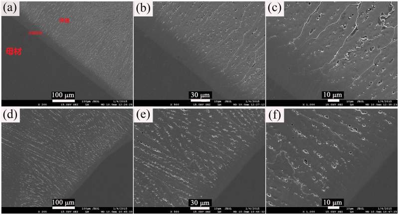 这是焊接的照片。图1中过渡区域应该是平面晶吧?a,b,c,是一组。d,e,f是一组。我发现这两组平面晶宽度是不一样的,上一组比下一组的宽,且在焊缝区域应该是柱状晶吧?晶粒大小也不一样。