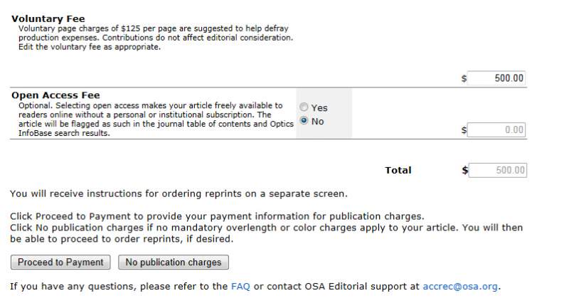 Voluntary page-charge contributions help defray the cost of editorial preparation and composition. These charges assist OSA in maintaining comparatively low subscription rates for OSA members and libraries, thus maximizing the dissemination of research results. Payment is neither an obligation nor a prerequisite for publication. In general, publication charges are regarded as an essential part of research budgets, since publication is the final process in a research project. As such, OSA asks authors to consider making voluntary contributions ($125 per page) in partial support of their research and to offset fundamental costs attached to its publication.