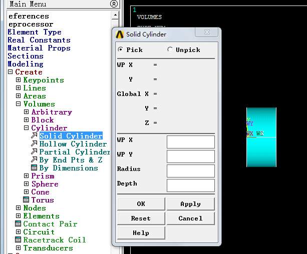 先将工作平面移动到右端面的中心处,并保持 wx-wy 平面与右端面一致。然后创建圆柱 (如你的图),输入 Radius 和 Depth 即可。
