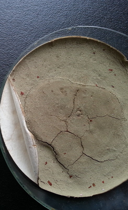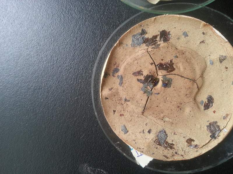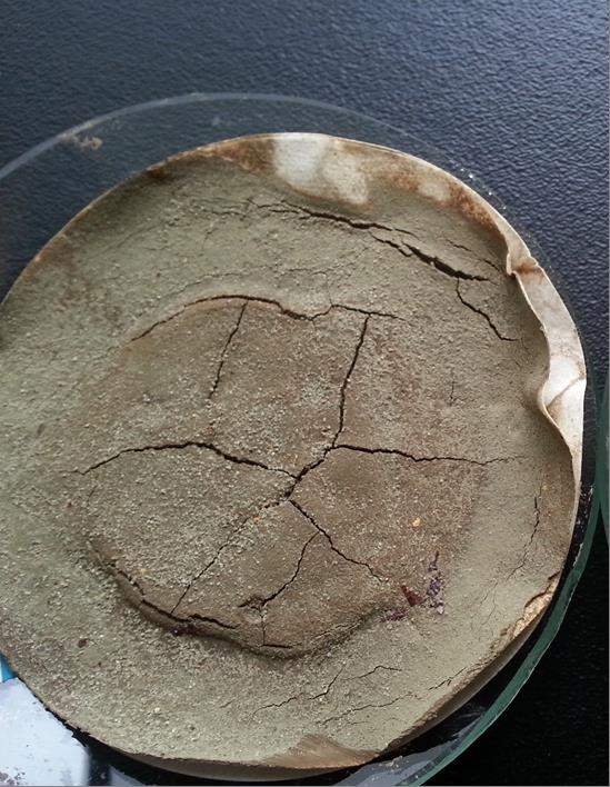 2、纯磷酸铁锂干燥后(干燥前也有)有暗墨绿色亮片(图1)或是暗橘红色亮片(图2)
