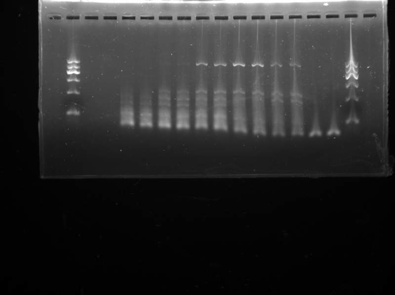 两边都点的marker最小的100bp,其次300bp,目的片段200bp,右边2和3是阴性对照,左到右,依次退火温度设置的是58,56,54,52,50每个样跑了两个条带,引物大小20bp,TM为55.8和59.8,cg为45和55