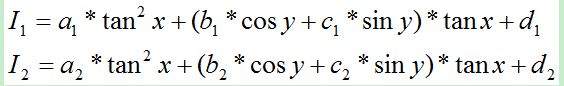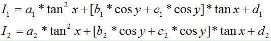 由(1)得出Cosy的用tgx表达的式子(3),然后代入(2),得到关于tgx为未知数的一元三次方程,求解得到tgx,从而得到x,再代入(3),得到Cosy和y。