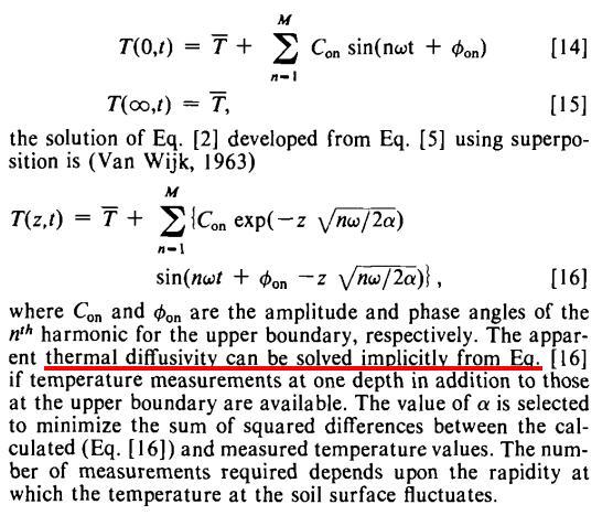 设土壤表面(0cm)日温度可表示为傅里叶级数形式:公式(14),地下温度则可以表示为公式(16),文献中说如果土壤表面和该层土壤的温度已知,就可以隐式的求解出参数α。我是先对土壤表面的温度曲线进行傅里叶级数的拟合,求出均温,振幅、相位、角频率作为初值,再集合经验给出α的初值,而后以土壤表面温度为基础,运用公式(16)(地下温度曲线与土壤表面温度曲线傅里叶拟合形式存在着振幅衰减和相位延迟的关系)预测地下温度,而后拿预测的和实际的该层土壤温度进行最小二乘,得出参数α。