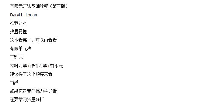 | 对有限元感兴趣的同学,可以学习学习,毕竟有限元理论也是非常重要的,研读有限元理论基础+仿真训练(软件操作),才能更好的理解运用有限元,希望与大家共同交流,共同学习。最后借用一位大神的语录与大家共勉:如果你怀疑这个软件,就不要用这个软件;如果你想学软件,先自己装好软件;如果你想会用软件,就找到自己的不足;如果你要熟练软件,就再看点基础理论。 |