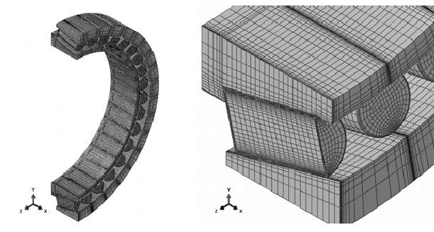 本人一直用的是ANSYS12.1经典界面,现在要算一个轴承滚子与内外圈接触的问题,需要接触线附近的网格很密,其他地方网格比较少,如图上所示的。 试着以接触线为轴线做了一个圆柱面,把体分割一下,还是划不出来,感觉ANSYS划分网格很难用。。。 有没有大神指导一下,用什么能划出图上的网格。谢谢。 1.jpg |