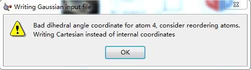 现在的原子排序导致4号原子用于构成内坐标的二面角数值很差,于是只能以笛卡尔坐标形式输出。建议检查4号原子与1,2,3号原子形成的二面角,对原子序号进行重排。