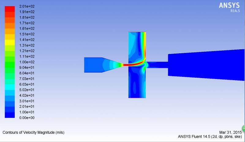 模拟钻井井下水力射孔的射流流场,左边是喷嘴,中间是环空,右边是孔道。