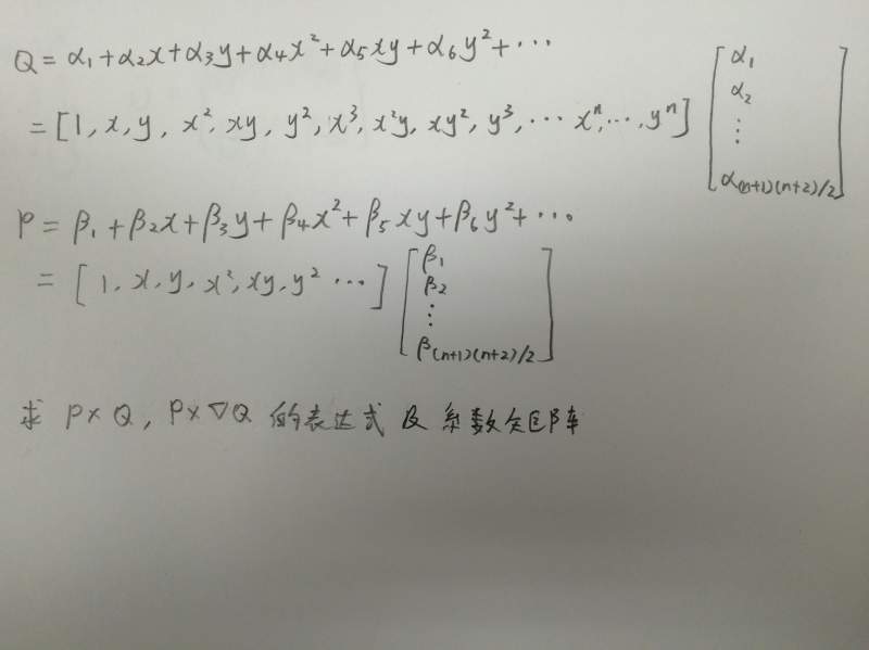 可以求出前面几项的所求目标,比如n=2,3,总结n项时规律.下面是n=2时的情况,系数矩阵可以自己写出来,总结n项的规律 A2 = {1, x, y, x^2, x*y, y^2}; B2 = {a1, a2, a3, a4, a5, a6}; C2 = {b1, b2, b3, b4, b5, b6}; Q = A2.B2 P = A2.C2 Out[3239]= a1 + a2 x + a4 x^2 + a3 y + a5 x y + a6 y^2 Out[3240]= b1 + b2 x + b4 x^2 + b3 y + b5 x y + b6 y^2 In[3251]:= Q1[x_, y_] = Q; In[3247]:= S = Expand[P*Q] Out[3247]= a1 b1 + a2 b1 x + a1 b2 x + a4 b1 x^2 + a2 b2 x^2 + a1 b4 x^2 + a4 b2 x^3 + a2 b4 x^3 + a4 b4 x^4 + a3 b1 y + a1 b3 y + a5 b1 x y + a3 b2 x y + a2 b3 x y + a1 b5 x y + a5 b2 x^2 y + a4 b3 x^2 y + a3 b4 x^2 y + a2 b5 x^2 y + a5 b4 x^3 y + a4 b5 x^3 y + a6 b1 y^2 + a3 b3 y^2 + a1 b6 y^2 + a6 b2 x y^2 + a5 b3 x y^2 + a3 b5 x y^2 + a2 b6 x y^2 + a6 b4 x^2 y^2 + a5 b5 x^2 y^2 + a4 b6 x^2 y^2 + a6 b3 y^3 + a3 b6 y^3 + a6 b5 x y^3 + a5 b6 x y^3 + a6 b6 y^4 In[3255]:= S1 = Expand[P*D[Q1[x, y], x, y]] Out[3255]= a5 b1 + a5 b2 x + a5 b4 x^2 + a5 b3 y + a5 b5 x y + a5 b6 y^2 |